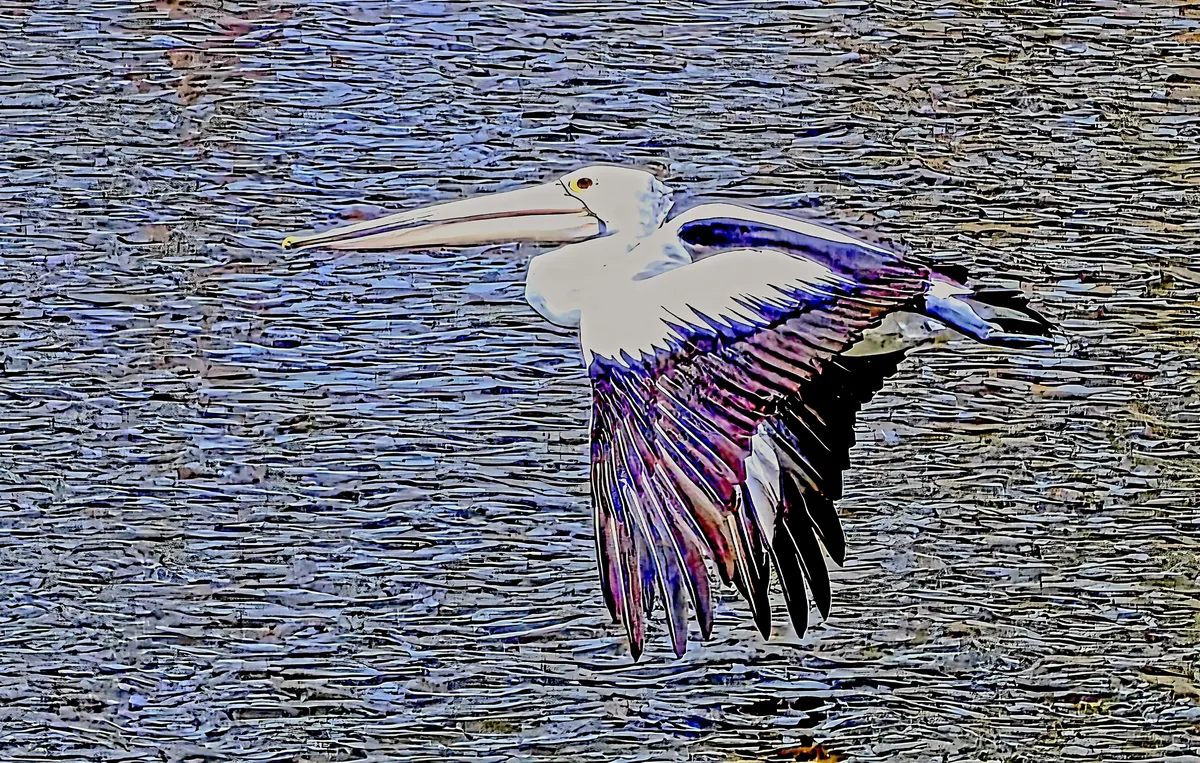 A pelican flying over the MacIntyre River, Rainbow Reserve, Kurumbul, Qld