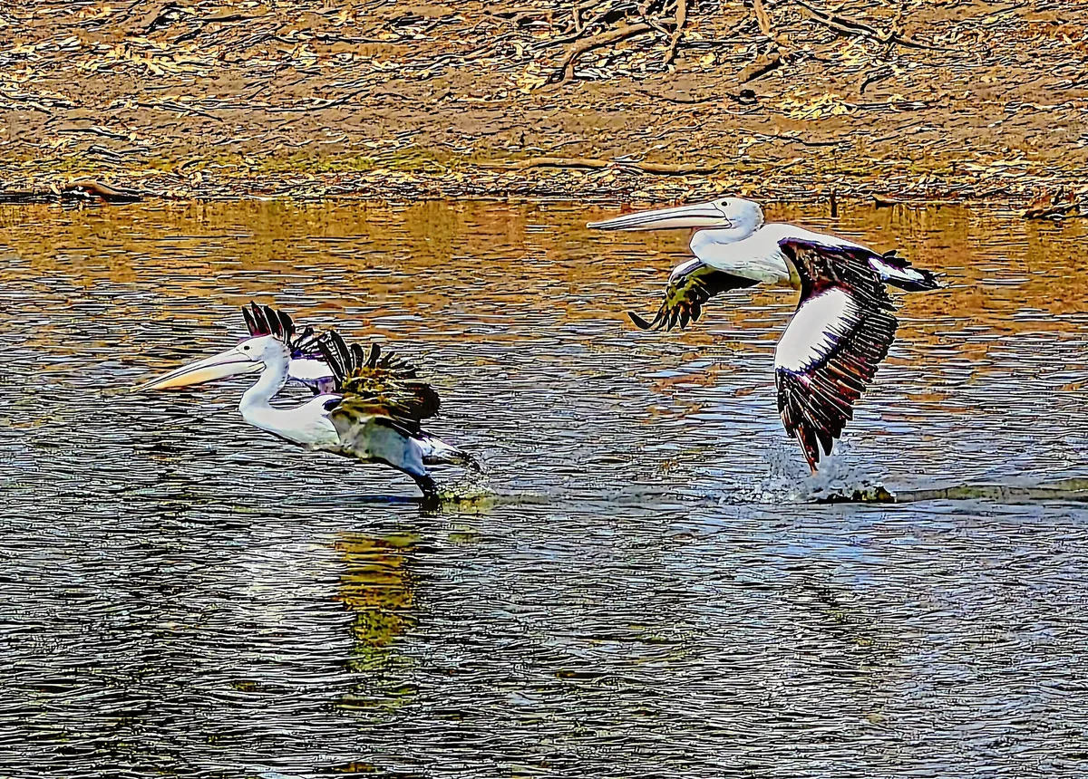 Pelicans taking off, MacIntyre River, Rainbow Reserve, Kurumbul, Qld