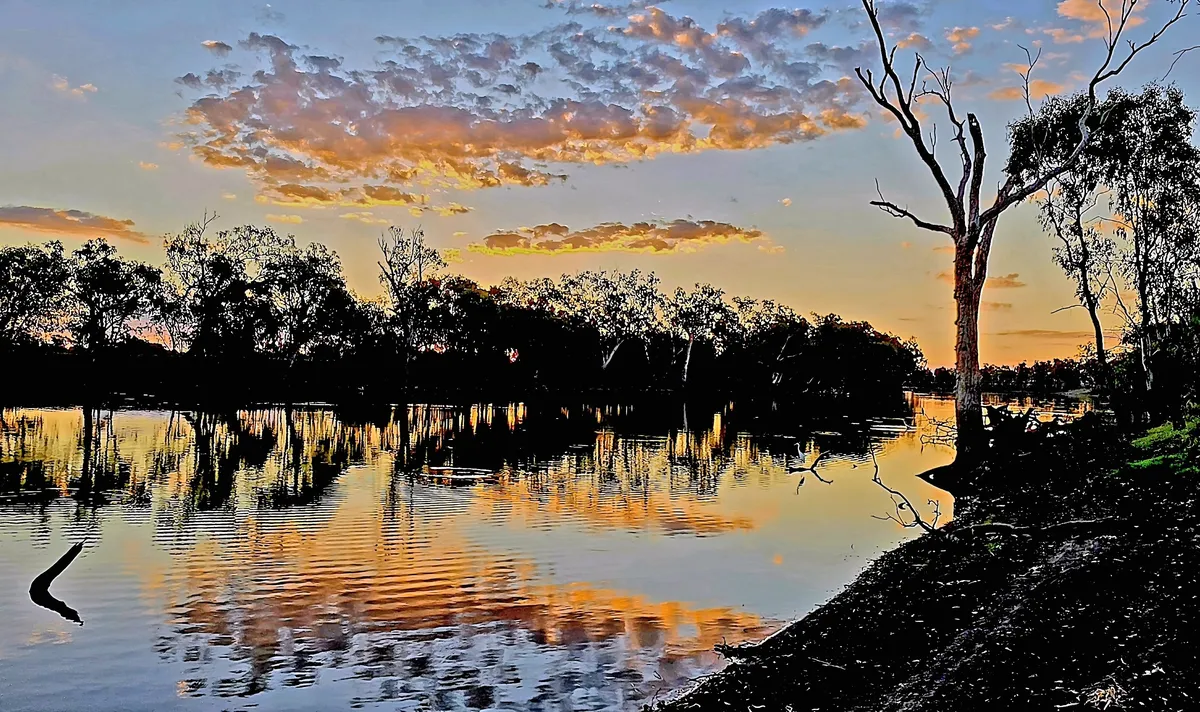 Sunset afterglow reflections, MacIntyre River, Rainbow Reserve, Kurumbul, Qld